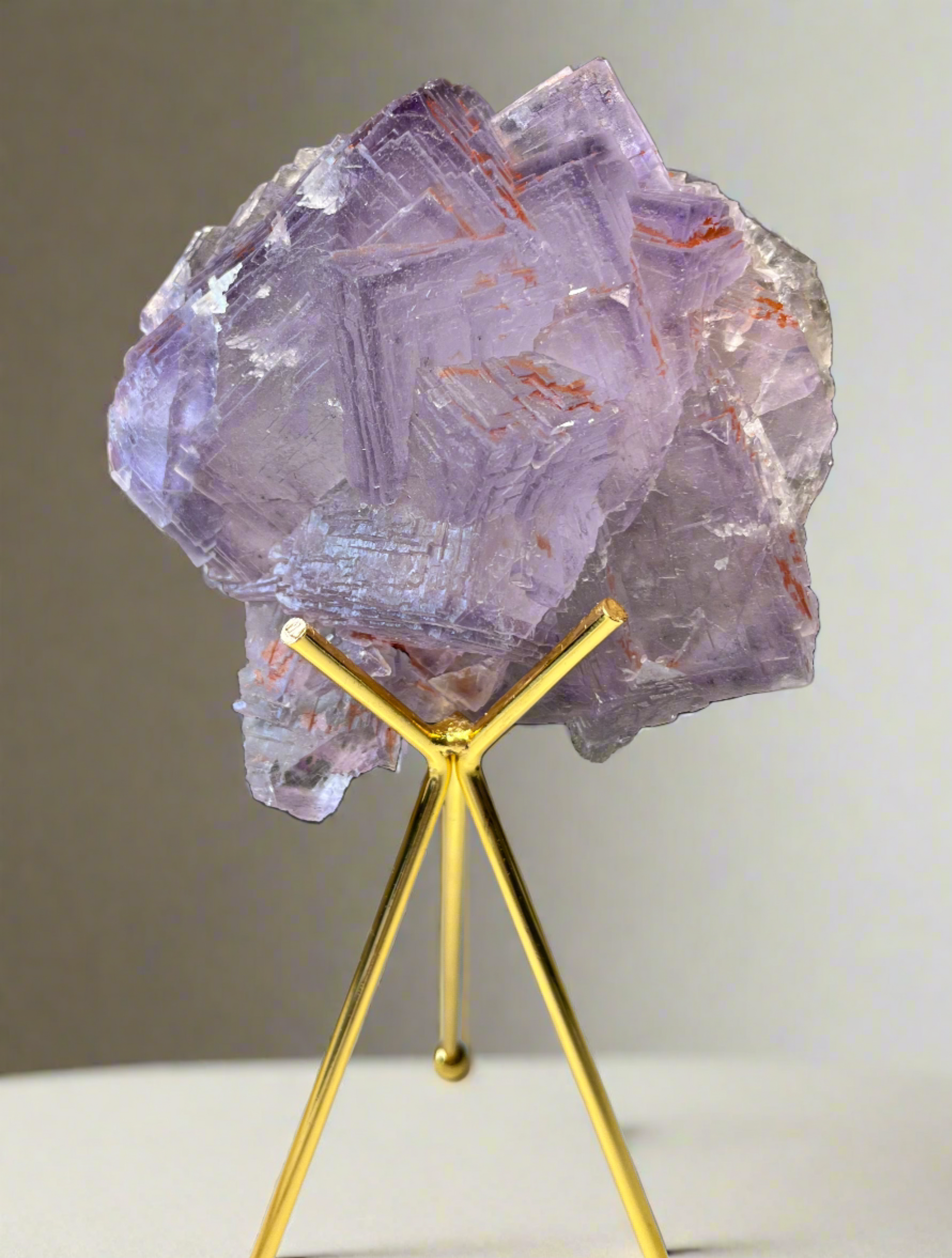 Beautiful Raw El Filo Fluorite Adorned with A lovely Gold Display Stand. Featuring light purple and peach hues, lovely cubic points, and stunning phantoms.