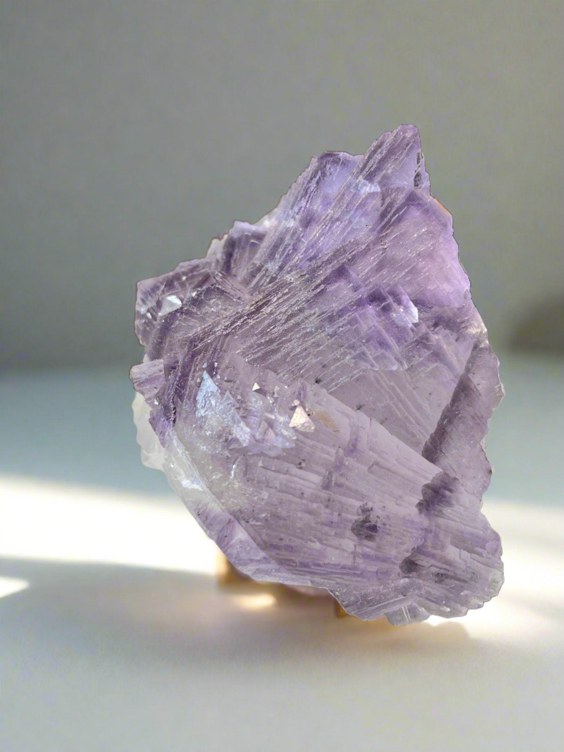Beautiful Raw El Filo Fluorite Adorned with A lovely acrylic and gold display stand. Featuring light purple and peach hues, lovely cubic points, and stunning phantoms.