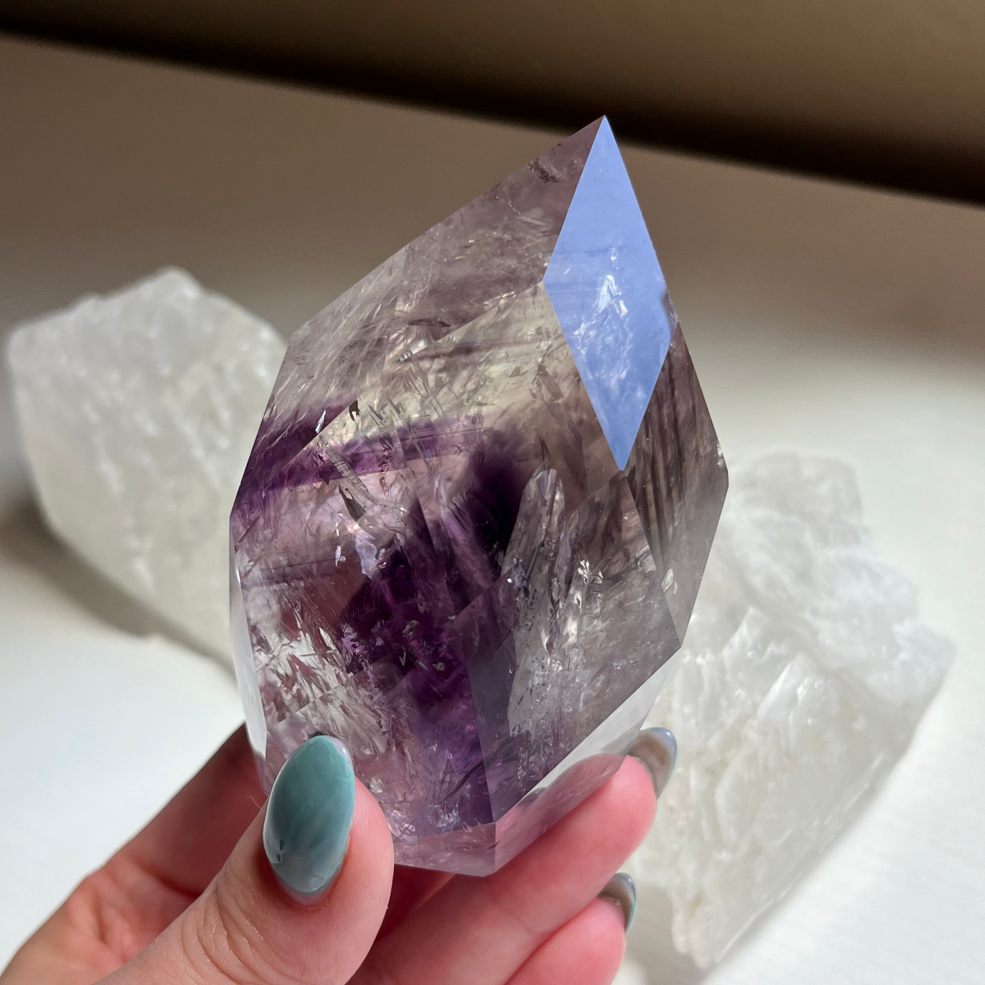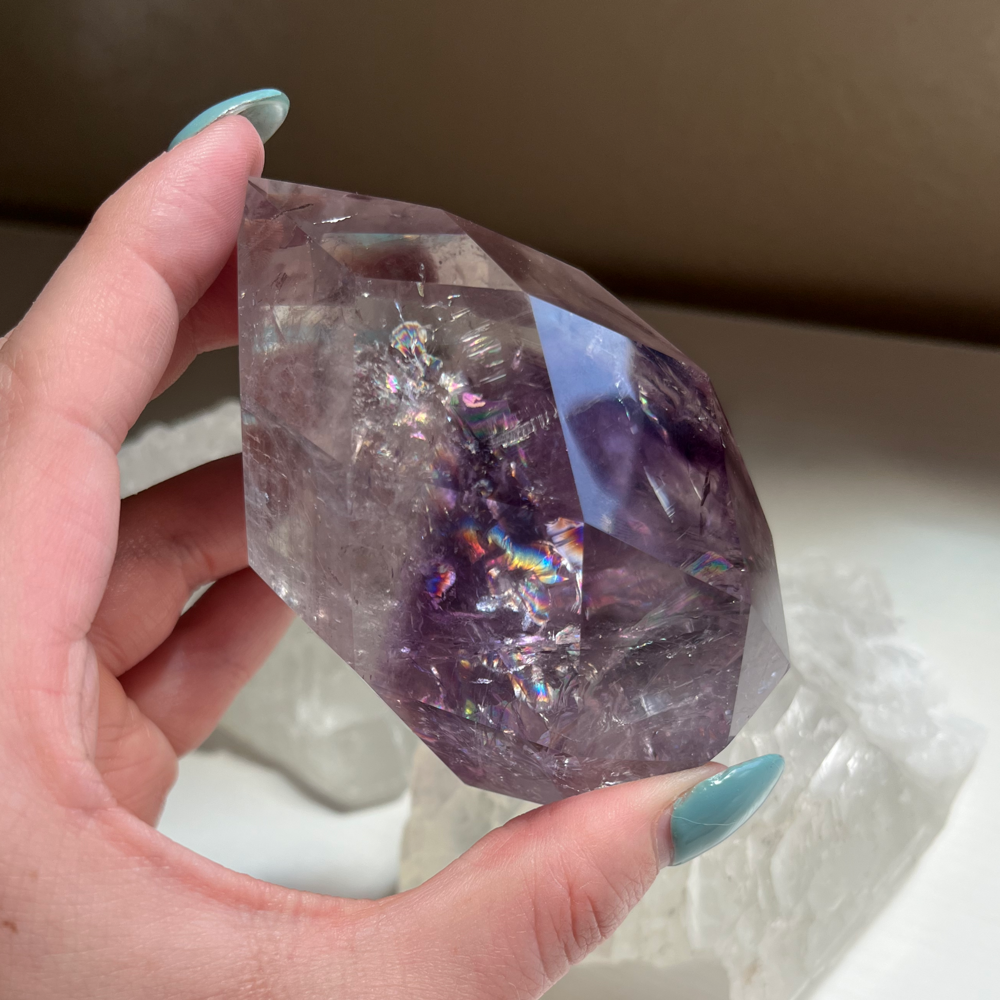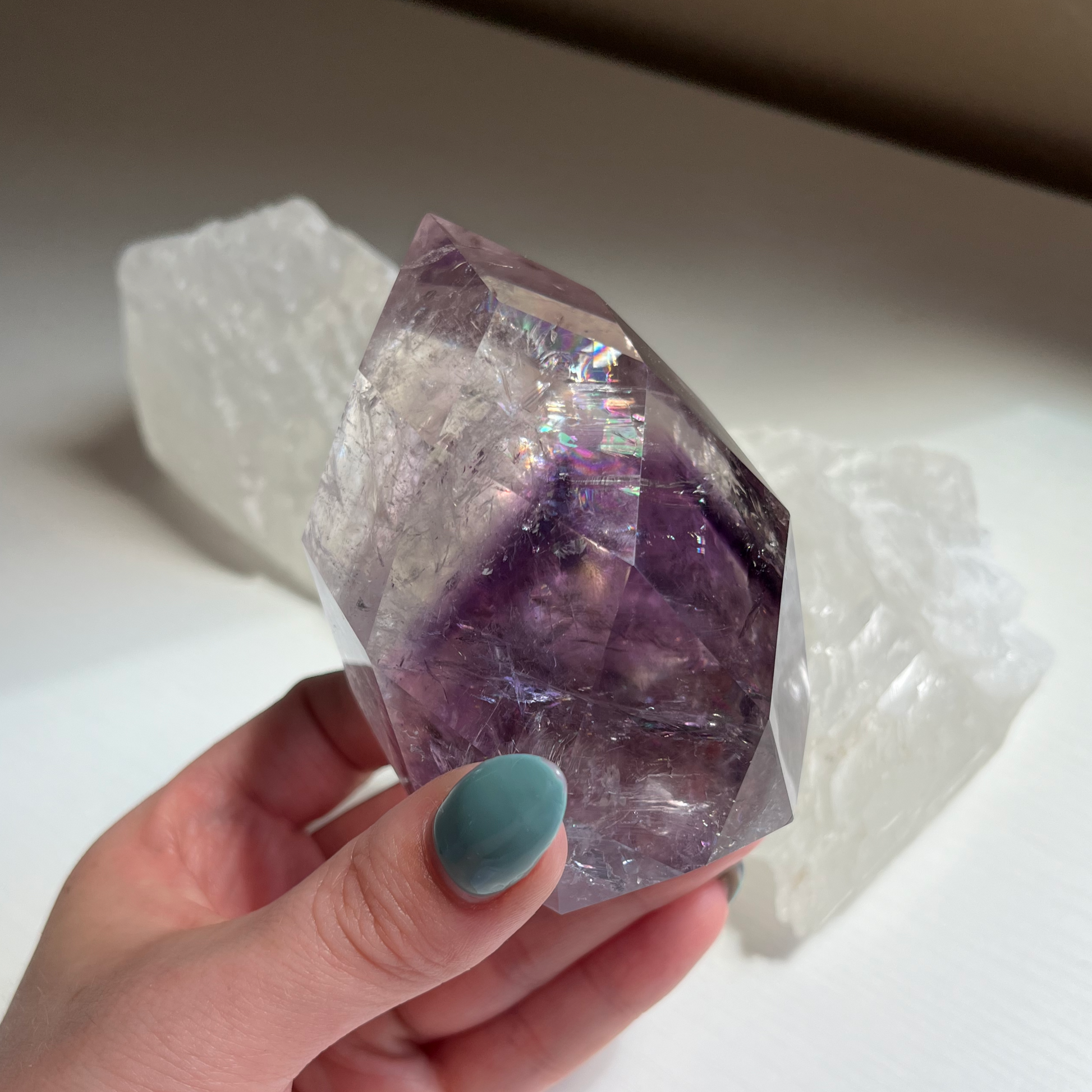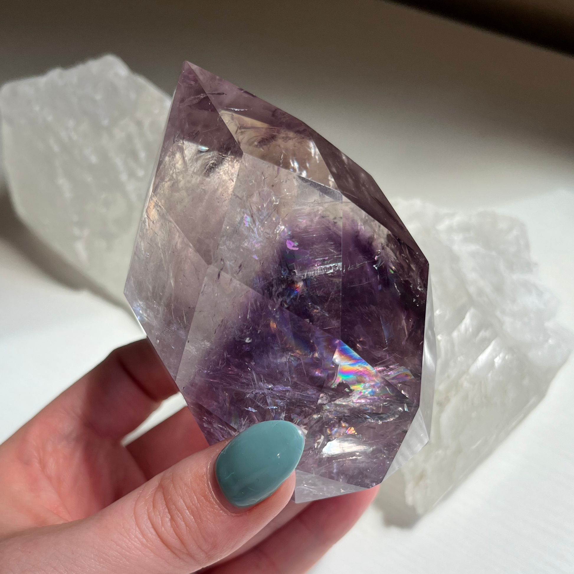 Enhance your inner divinity with our Faceted Phantom Amethyst Flame. This exceptional quality crystal combines the power of Phantom Amethyst and Quartz to provide protection against negative energy. With its peaceful and balancing energy, it brings comfort and harmony to both people and nature. And let's not forget the beautiful rainbows that add an extra touch of tranquility.