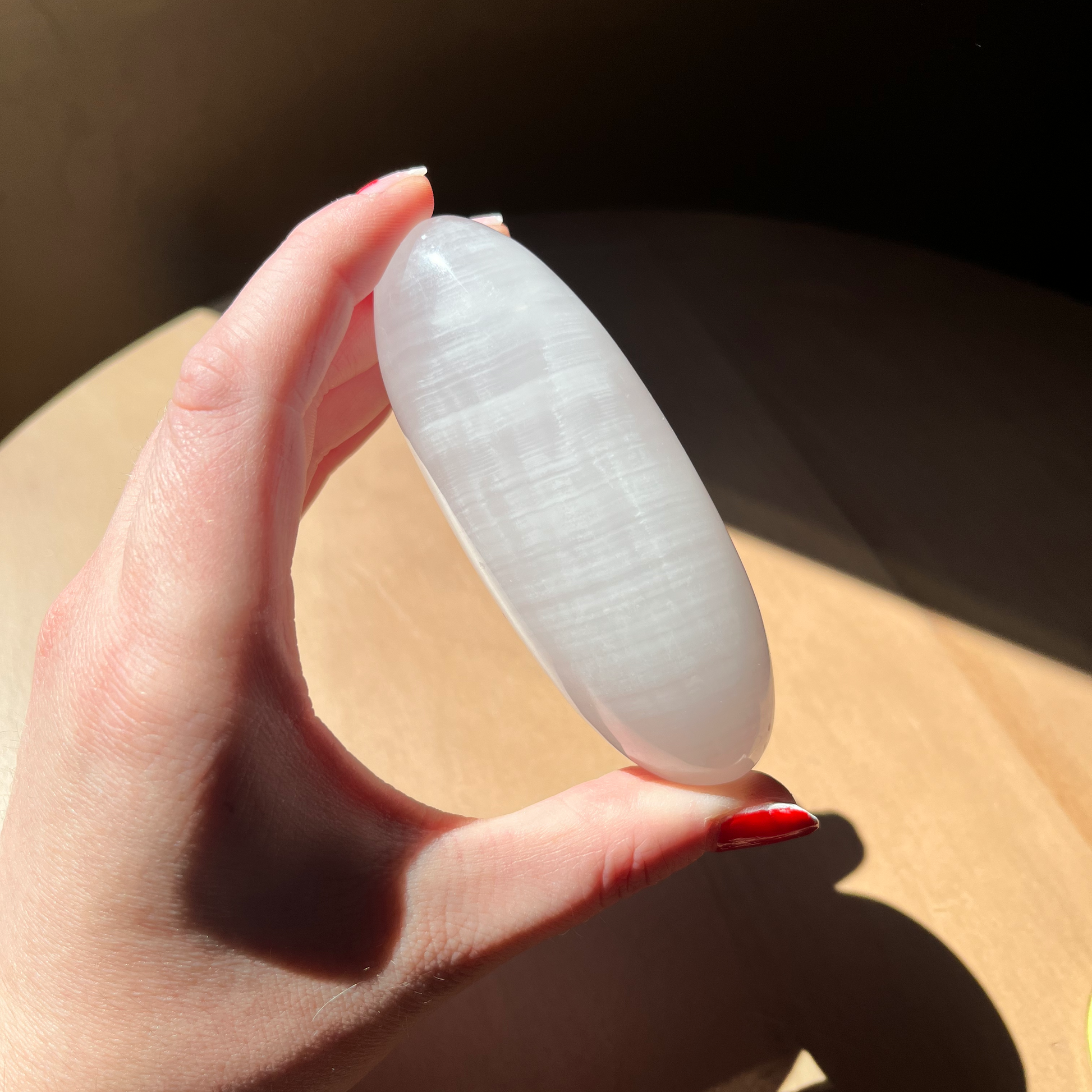 Gorgeous Mangano Calcite shiva featuring charming bands, a velvety finish, and wait for it - it glows under UV light! This calming stone boasts a delicate, soft pink color.